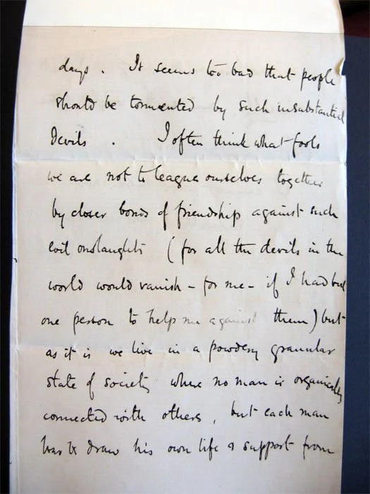 I often think what fools we are not to league ourselves together by closer bonds of friendship against such evil onslaught (for all the devils in the world would vanish – for me – if I had but one person to help me against them) but as it is we live in a powdery granular state of society where no man is organically connected with others, but each man has to draw his own life & support from no one (as you delight to say) but himself; and so the weight of the world is many times trebled.