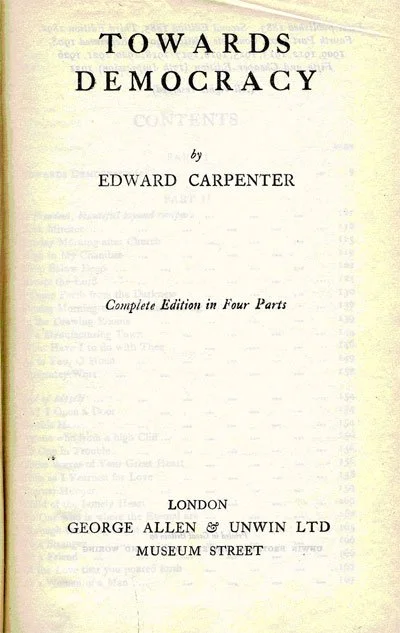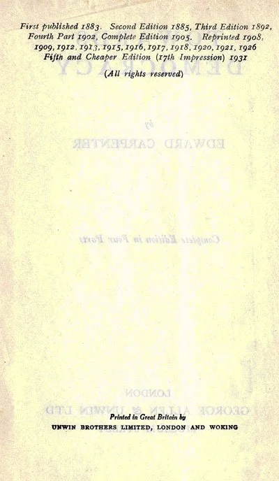 I'll end this short piece by going back to the early days of Towards Democracy. The first edition nowhere carried EC's name. Plenty of copies survive and most of those I have seen have inscriptions. This one is from the copy EC gave to his brother. The 2nd edition was double the size. This edition still did not give EC as author but he did claim copyright. This copy was given by EC to George Hukin., one of EC's three lovers called George. The 3rd edition is a very rare book, far more difficult to find than the first. EC published Part 4 of TD as a separate book. But it was followed almost immediatelt by the first complete edition so EC seems to have been left with a lot of unsold copies. It is quite common and the number signed by EC suggests he kept them at Millthorpe as gifts for visiting admirers.